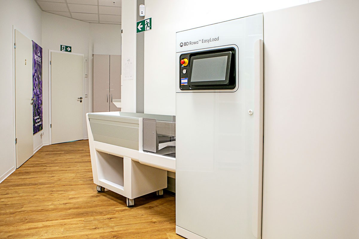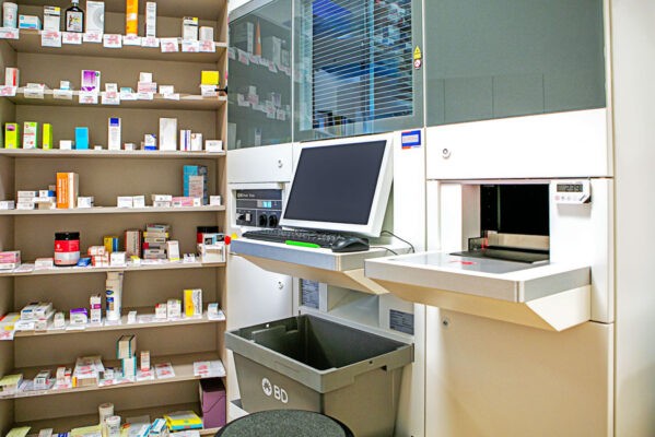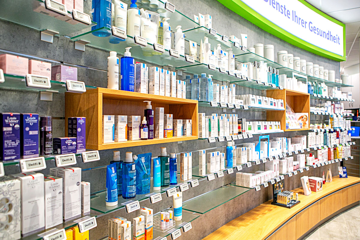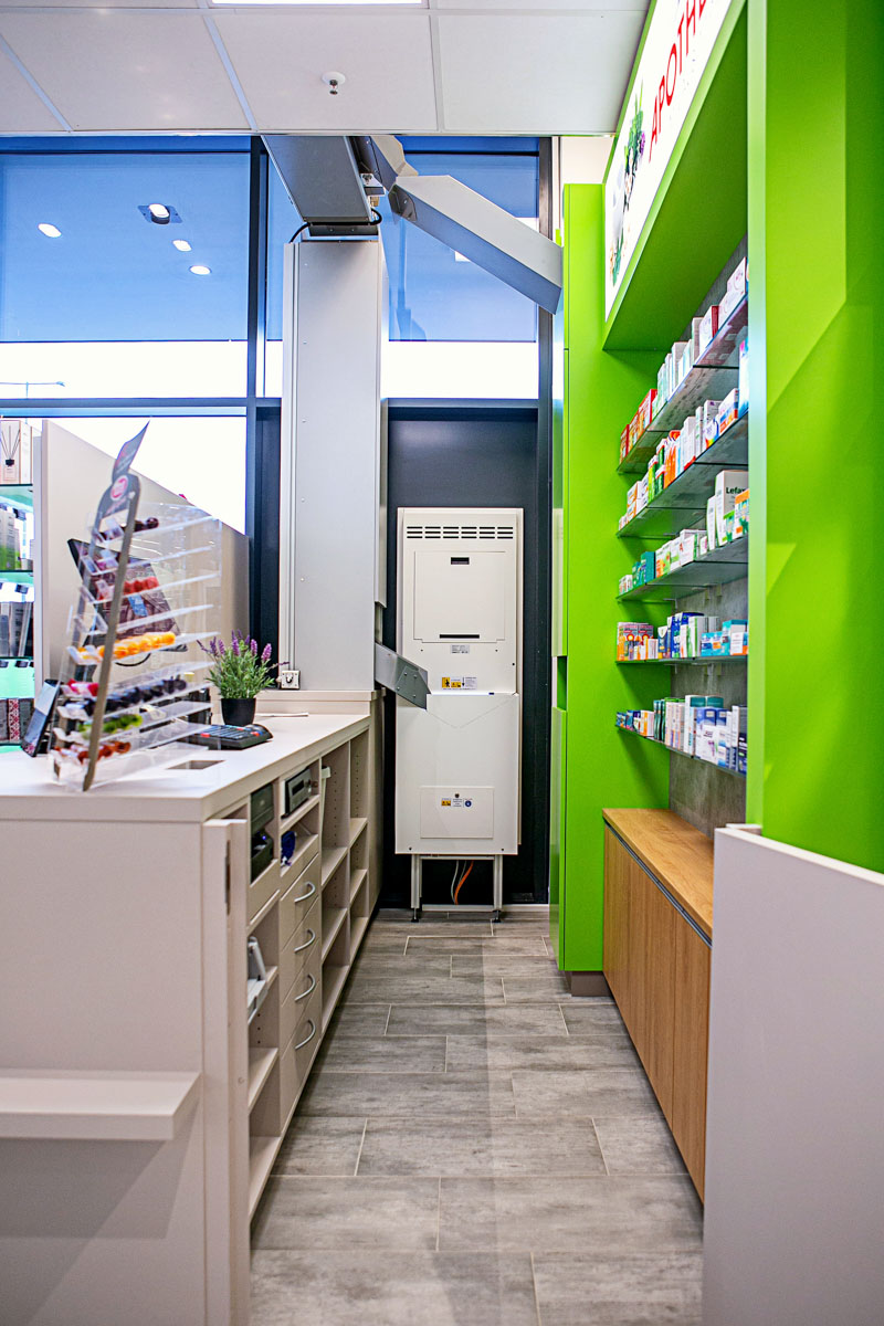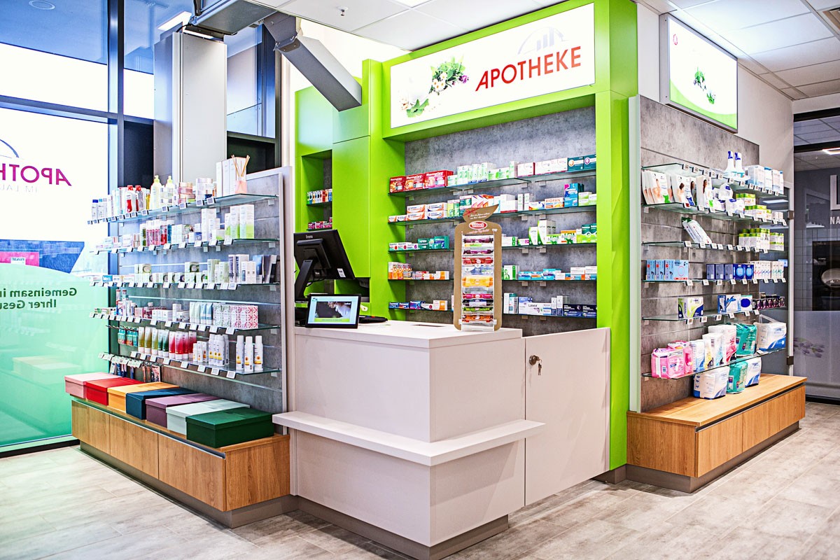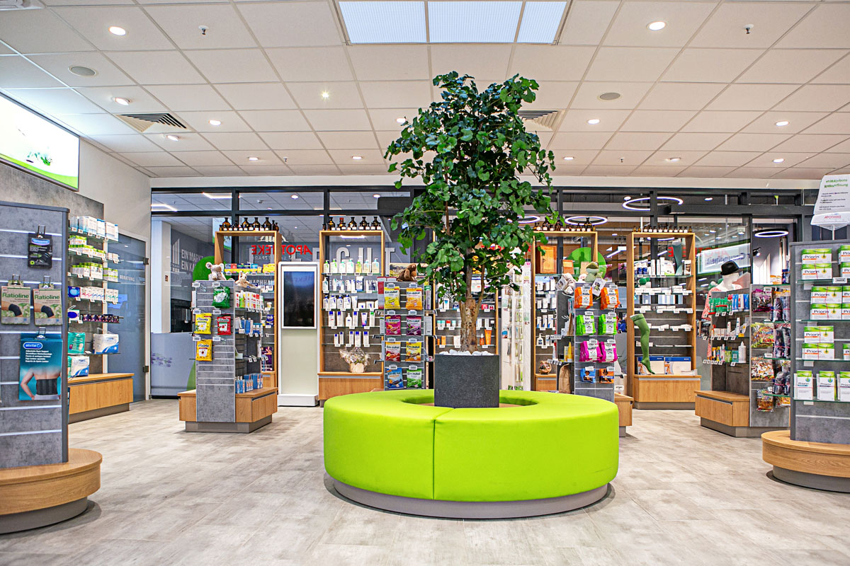 Mit dem Neubau des Erweiterungsbaus bot sich die ideale Gelegenheit, die Apotheke modern, kundenorientiert und zukunftsweisend zu gestalten. Auf rund 300 m² entstand ein innovatives Konzept, dessen Herzstück der ROWA-Automat mit EasyLoad- Einlagerung und direkter Anbindung an das Pickup- Abholterminal bildet. Das Abholterminal wurde in eine eigene Schnellkassenbox in der Offizin integriert. So kann diese nicht nur für den Notdienst, sondern auch als zusätzliche Kasse genutzt werden. Ein besonderes Augenmerk lag auf der individuellen Beratung: Drei separate Beratungsräume schaffen Raum für unterschiedliche Anwendungen und sorgen für eine vertrauliche, persönliche Betreuung. Als Highlight und Ruhepol für die Kundinnen und Kunden entstand zudem eine runde Wartezone im Zentrum der Offizin, die durch einen Ginkgo-Baum eine natürliche, einladende Atmosphäre vermittelt. Heute zeigt sich die Apotheke in neuem Glanz – sehr zur Freude aller Beteiligten und insbesondere der Kunden.
